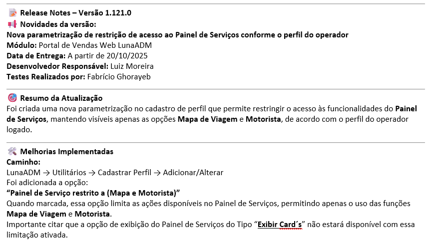Módulo: Luna ADM. Versão: 1.121.0 ou superiores. Nº Ticket: 0825-004739xxxx. Solicitação: SIM nº 45527 Task: 557880 Caminho de acesso: Luna ADM [Caminho]: Utilitários → Cadastrar Perfil → Adicionar/Alterar |