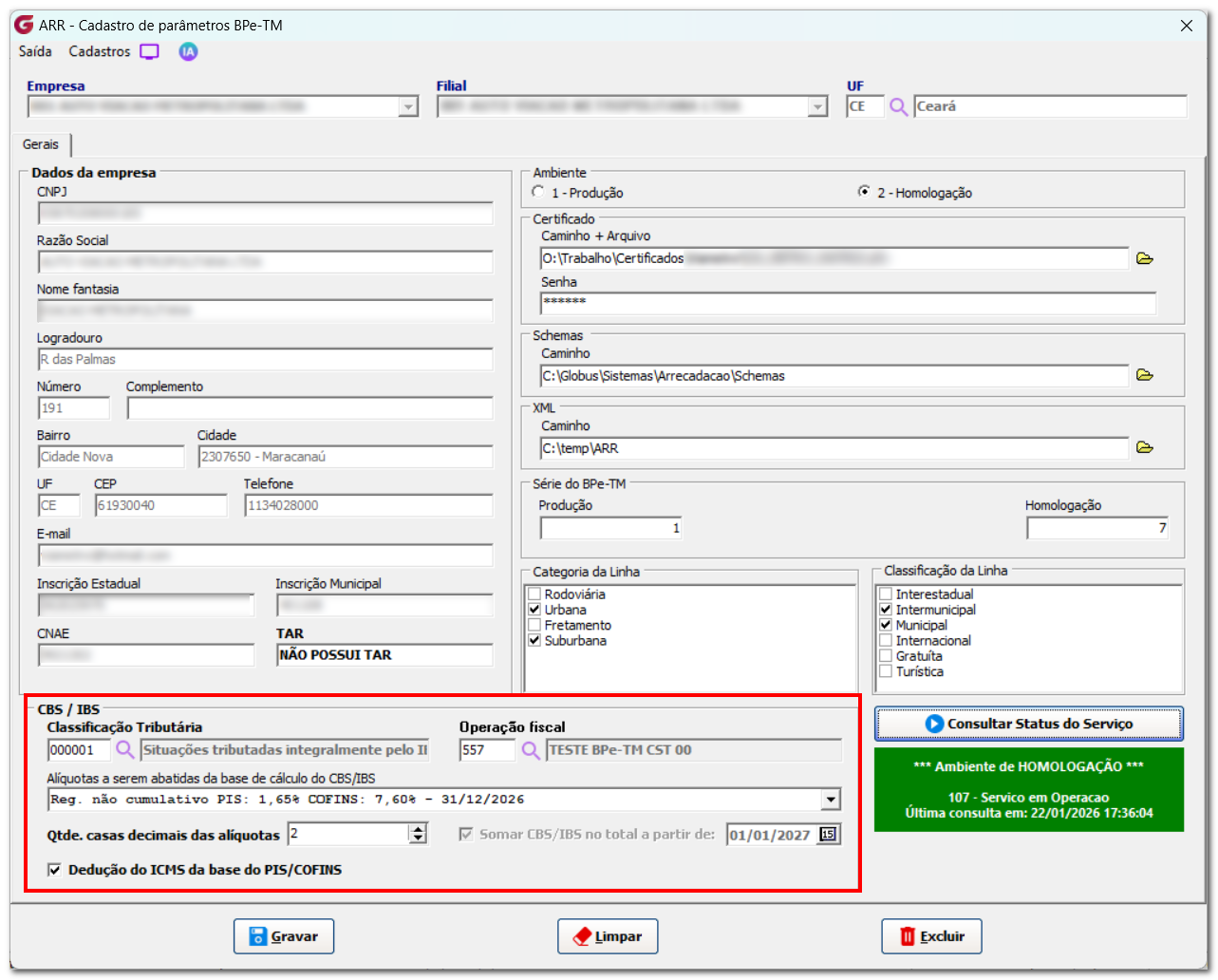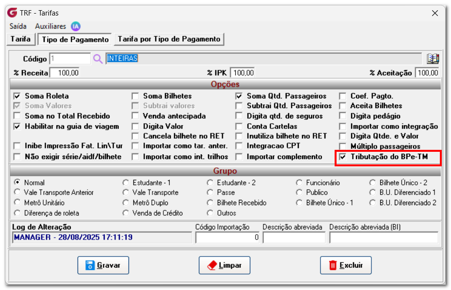 Parâmetro no módulo de Tráfego: A partir desta implementação, teremos que configurar todos os tipos de pagamentos do módulo de “Tráfego”, pois foi criado a flag “Tributação BPeTM” e só serão gerados os tipos de pagamentos que precisam ser tributados. Para que o envio do documento ocorra com sucesso, é necessária a correta parametrização do sistema, com o preenchimento dos campos destacados na imagem abaixo: Módulo ARR >> Procedimentos auxiliares >> BPe-TM >> Parâmetros BPe-TM