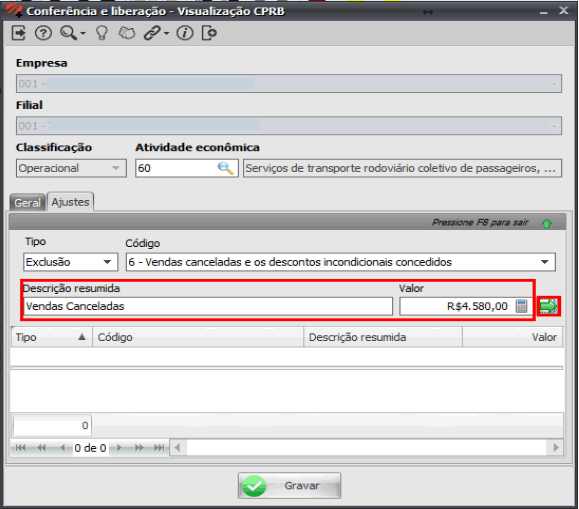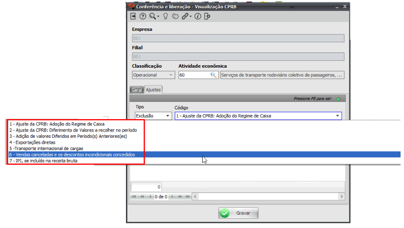 Vai abrir a mesma tela, porém, agora sem informações e todos os campos devem ser preenchidos, exceto alíquota, que já é preenchida com o Código da Atividade Econômica e o valor CPRB, que já é preenchida de acordo com a receita bruta digitada e alíquota informada . Adições e exclusões são preenchidas de acordo com as informações da aba de ajustes: