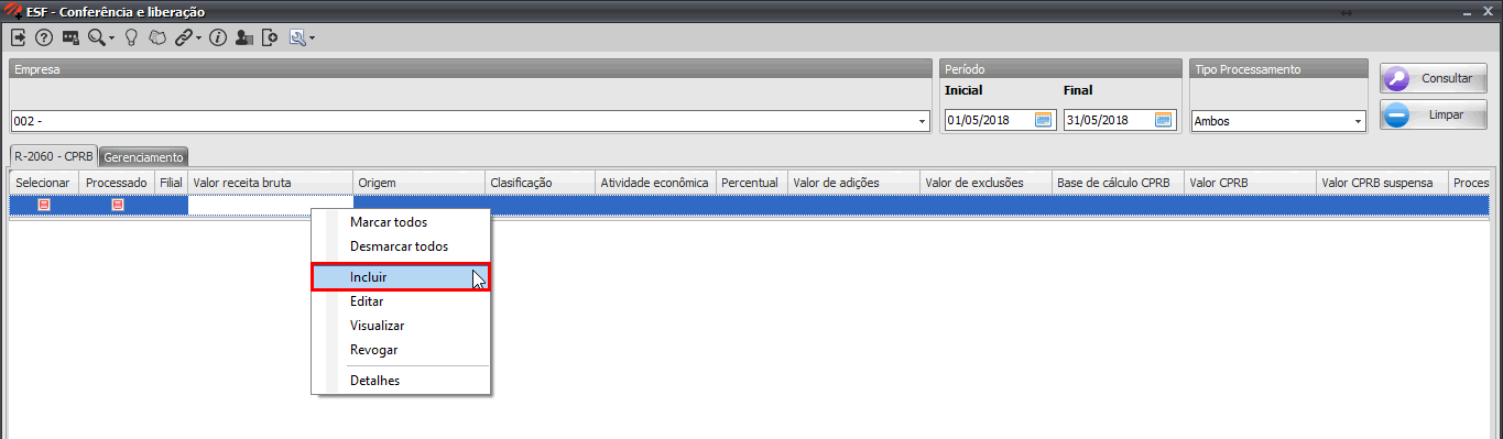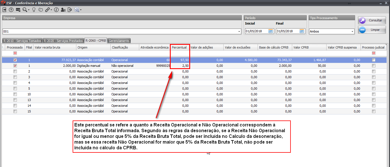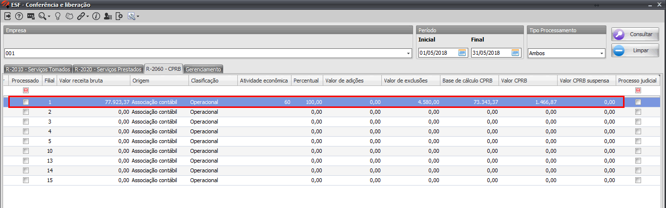 Através da associação acima, na tela de conferencia e liberação – aba: CPRB - R-2060 irá aparecer todas as filiais cadastradas na empresa, e os valores das associações de contas que tenham movimento no período indicado na tela: