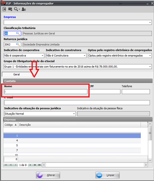 Preencha o campo Nome, com o nome do contato na empresa, ou seja, o nome de pessoa responsável por ser o contato do empregador com os órgãos gestores do eSocial.