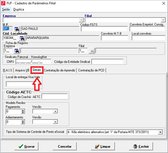Caso essa mensagem seja apresentada acesse o Cadastros à Cadastros Auxiliares à Parâmetros Filial e localize o registro da filial e acesse a aba Gerais.