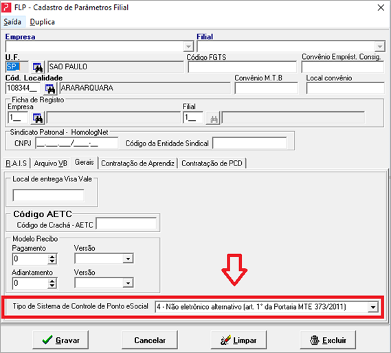 Preencha o campo “Tipo de Sistema de Controle de Ponto eSocial”.