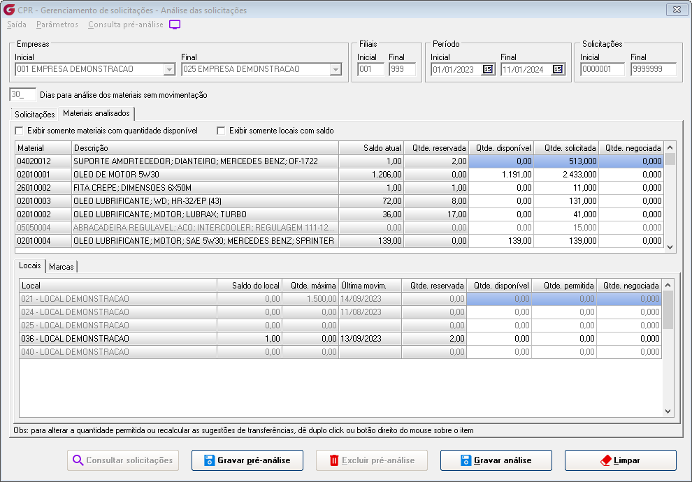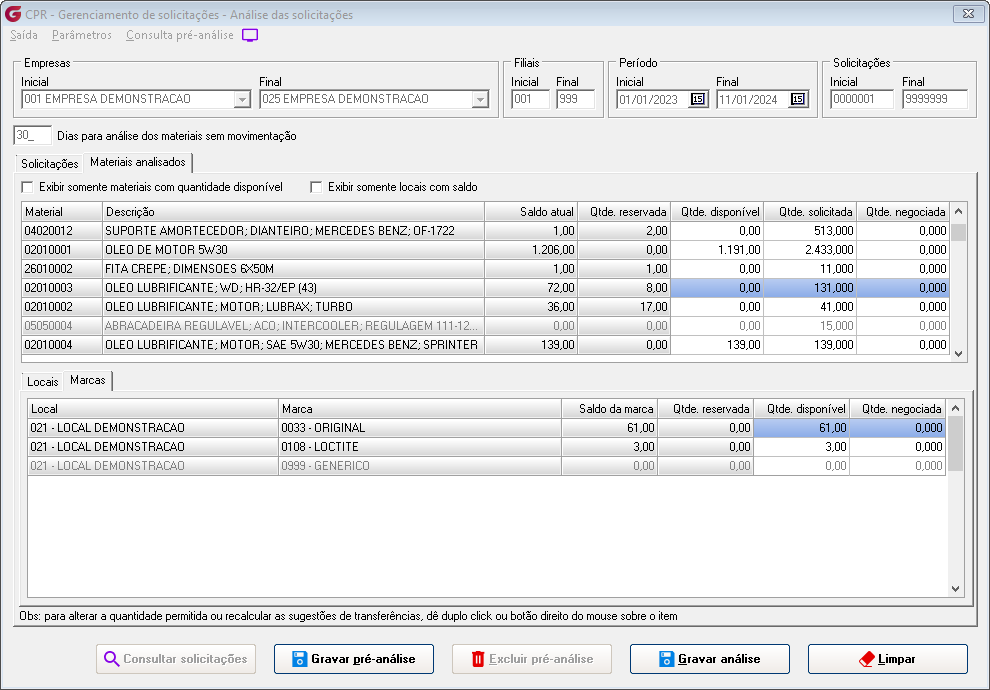 Na aba Materiais analisados da tela, serão demonstrados no primeiro grid todos os materiais que fazem parte das solicitações, o saldo atual do material, a quantidade disponível para transferência e a quantidade negociada. Os materiais apresentados em vermelho indicam que existe quantidade sugerida para transferência. O saldo atual será a soma do saldo de todos os locais. A quantidade disponível será a quantidade que pode ser transferida, respeitando a regra de somente poder transferir se o saldo do material no local estiver acima do estoque máximo ou se o material não tiver movimentação no local dentro do período informado na tela, no filtro "Dias para analise dos materiais sem movimentação". A quantidade negociada será a soma das quantidades sugeridas para transferência. Selecionando um material, serão atualizados os grids dentro das abas Locais e Marcas. No grid da aba Locais, serão exibidos os locais associados ao material com a quantidade máxima, o saldo do material no local, a data da última movimentação do material no local, a quantidade disponível para transferência de acordo com a regra de análise e a quantidade negociada, ou seja, a quantidade sugerida para transferência do local.