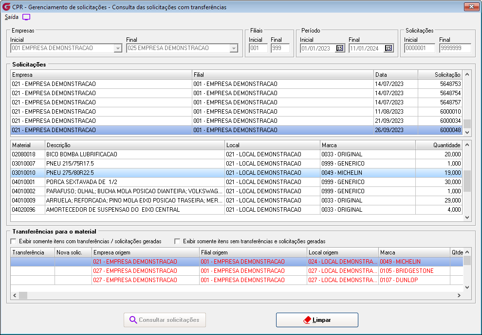 Solicitação> Gerenciamento de solicitações>Consulta das solicitações Esta tela será utilizada pelos usuários das filiais que geraram a solicitação, para consulta do processo de transferência realizado ou que estão aguardando a geração da transferência. Os filtros informados nesta tela serão referentes às solicitações: empresa inicial e final, filial inicial e final, período e solicitações inicial e final. No primeiro grid da tela serão exibidas as solicitações em que, pelo menos, um material foi selecionado para geração da transferência. Selecionando uma solicitação, no segundo grid serão demonstrados os materiais, locais e marcas que constam na solicitação e que fazem parte do processo de transferência, juntamente com a quantidade sugerida para transferência. Ao selecionar um material do segundo grid, serão demonstradas no terceiro grid as transferências geradas (já com o número da transferência preenchido) ou aguardando geração (linha destacada em vermelho) empresa, filial e local de origem da transferência, marca e quantidade transferida.