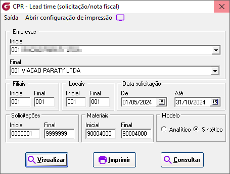Módulo: Compras (CPR) Caminho de acesso: >Auxiliares> Gera lead time >Cadastro> Materiais >Solicitação> automática por lead time >Relatórios> Solicitação> Lead time (solicitação/nota fiscal) |