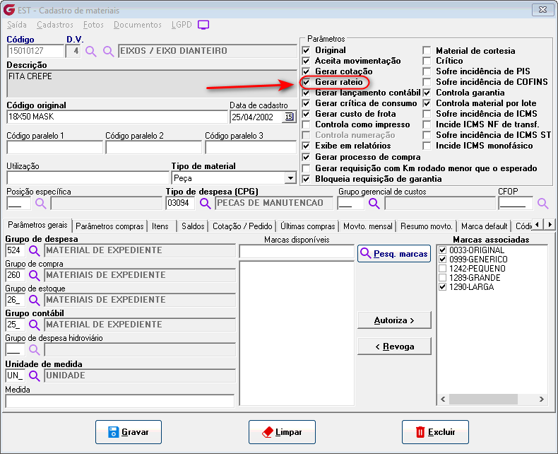Cadastros>Agrupamento>Material com grupo de rateio Na tela para associação de materiais aos grupos de rateio, a pesquisa apresenta apenas os materiais cadastrados com a opção gerar rateio marcada.