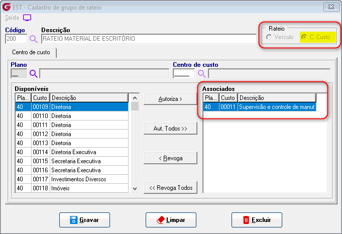 Cadastros>Grupos>Rateio Na tela de cadastro de grupos de rateio defina se o rateio deve ser por veículo ou centro de custo.