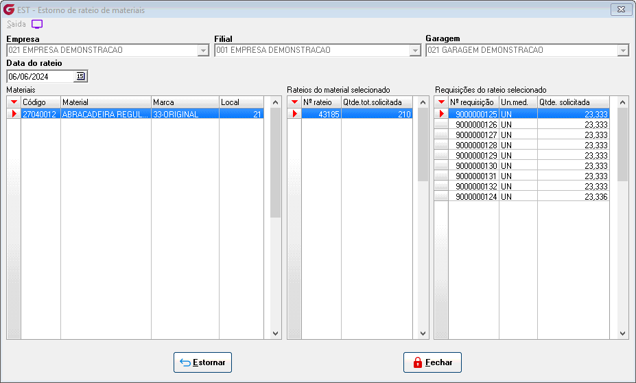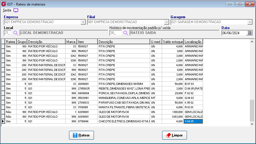 Realizar saída por rateio de materiais, podendo ser por veículos ou centro de custos. |