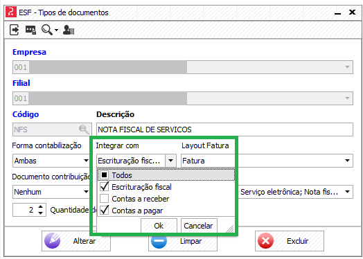 Poderá preencher todas as abas ou apenas a referente o que precisa integrar: documentos de entrada, saída ou serviços.