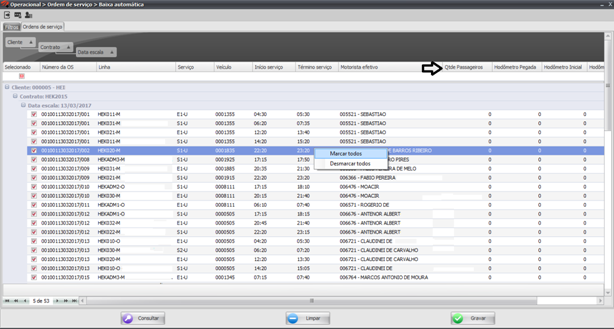 Ainda na tela de baixa automática, se desejar, o usuário poderá informar o Odômetro e a quantidade de passageiros de cada serviço, depois disso, poderá marcar quais são os serviços que serão gerados ou marcar todos (através do botão direito do mouse) e poderá gravar.