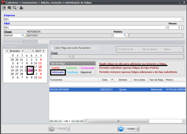 Lembrando que para remover, não é possível se a folga for padrão, só é permitido remover se a folga for do tipo adicional ou substituto.