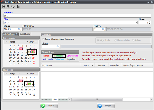 Clicando na data da aba "folgas atuais" o dia será substituído, e na aba de baixo o dia que será a nova folga, as datas precisam ficar em verde, e pronto é só gravar.