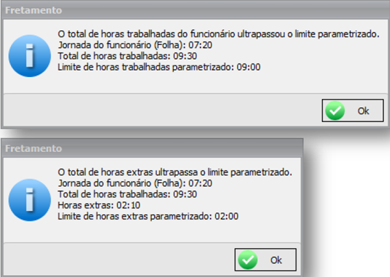 Nestas telas (exceto a Geração da escala), dependendo da configuração definida no parâmetro (Alerta ou Bloqueia), o sistema irá apresentar uma mensagem quando informar um funcionário e ele ultrapassar o limite de horas trabalhadas ou horas extras. Se estiver definido para Alertar, o usuário poderá optar por escalar o funcionário ou não, se estiver para bloquear, deverá informar outro funcionário.