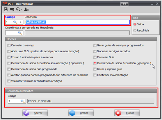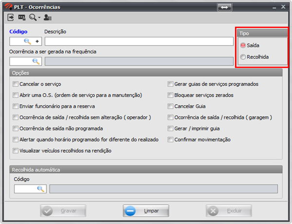 Essas ocorrências serão utilizadas na tela de movimentação do módulo (saída e recolhida) e de acordo com a parametrização de