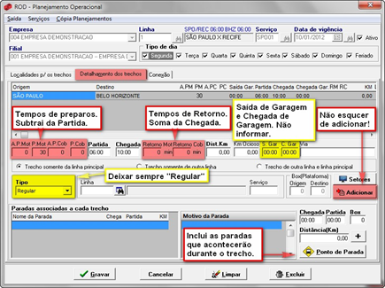 Dica: Após cadastrar os horários do trecho, do funcionário e Km, NÃO esquecer de clicar no botão "Adicionar", caso contrário as informações não serão validadas no sistema.