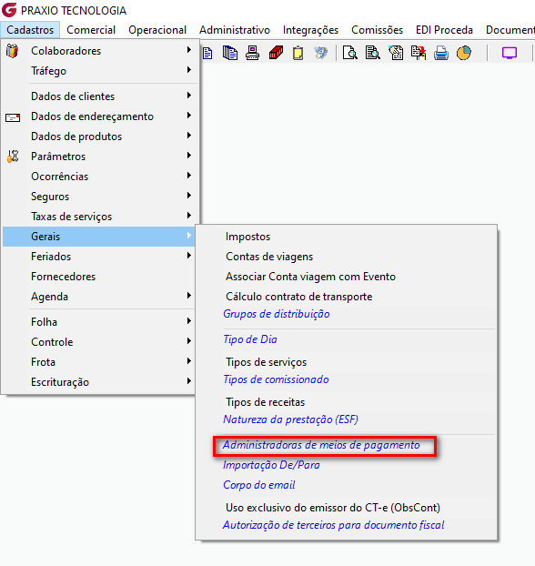 Cadastros > Gerais > Administradoras de meios de pagamento