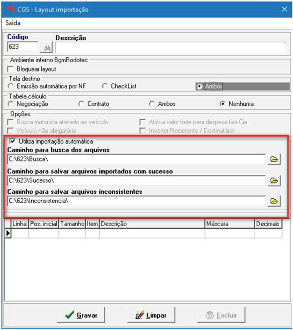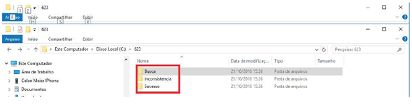Criado layout 623 onde é possível parametrizar as pastas em que serão feitas a busca dos arquivos, as inconsistências e a gravação dos arquivos importados com sucesso.