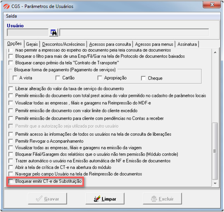 Criado na tela "Cadastros > Parâmetros > Usuários" o parâmetro "Bloquear emissão de CT-e de substituição", selecionando esse parâmetro o usuário não terá permissão para emissão desse tipo de CT-e.