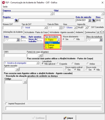 Ainda na aba “Informações do Acidente”, com a simplificação do eSocial o campo ‘Tipo de acidente’ passar a ter somente três opções: 1 – Típico 2 – Doença 3 - Trajeto