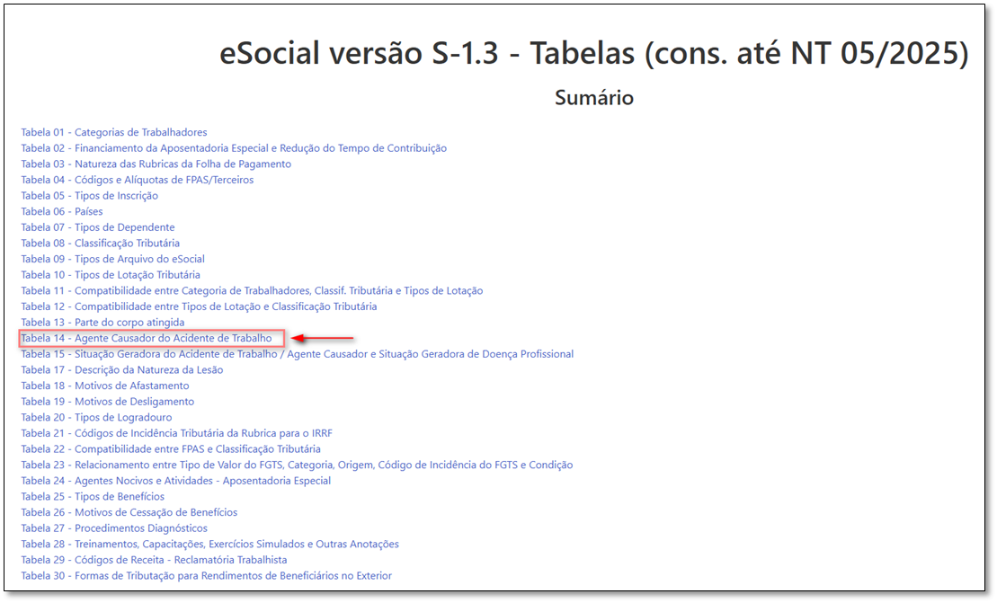 Nesse caso, o campo “Agente causador” só permitirá a seleção dos códigos específicos da Tabela 14 do eSocial (eSocial versão S-1.3 - Tabelas).