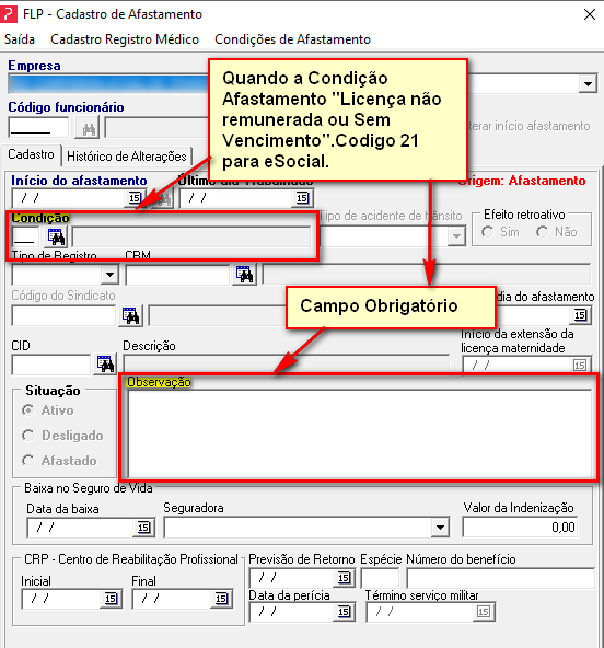 Preencher o campo Observação quando código afastamento for "Licença Não remunerada ou Sem Vencimento”. Para o eSocial código 21.