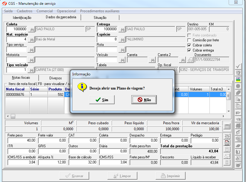 O sistema irá perguntar se deseja abrir um contrato de transporte.