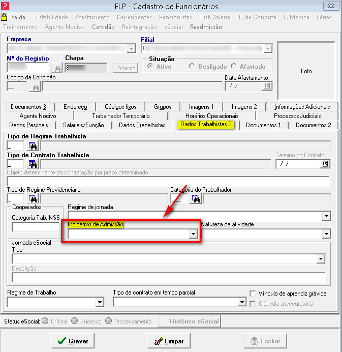 Acessar o menu: FLP Cadastro --> Funcionários --> Cadastro de Funcionários aba Dados Trabalhistas 2 preencher o campo Indicativo de Admissão.