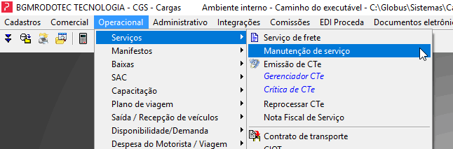 Passo 1: Acessar a tela ‘Manutenção de Serviços’, através da sequência de menus ‘Operacional à Serviços à Manutenção de Serviços’.