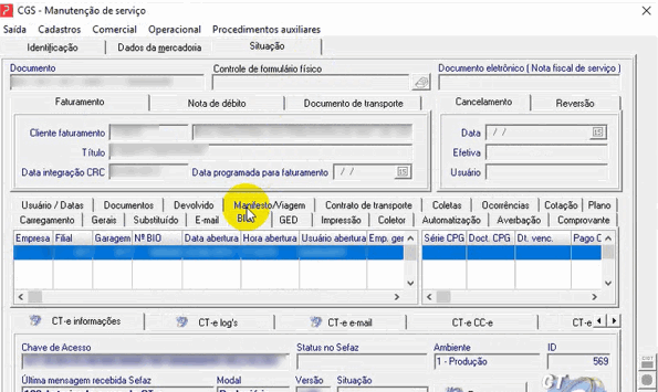 Passo 2: Na tela ‘Manutenção de Serviços’, após pesquisar o documento para consulta, acesse a aba ‘Situação’ e em seguida a aba ‘BIO’.