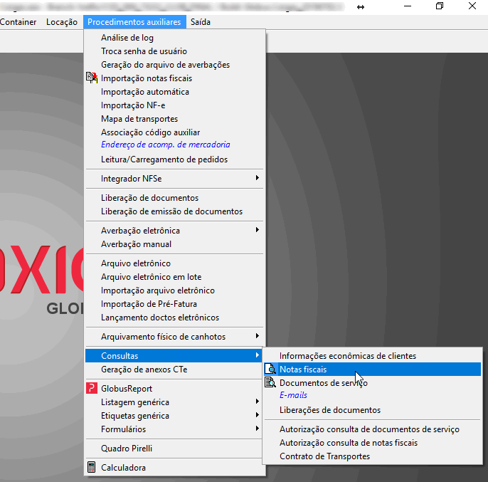Módulo Cargas à Operacional à Serviços à Manutenção de Serviços Módulo Cargas à Procedimentos Auxiliares à Consultas à Documentos de Serviços Módulo Cargas à Procedimentos Auxiliares à Consultas à Notas Fiscais