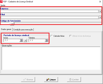As informações em vermelho são obrigatórias: Empresa, Filial, código funcionário, período da licença.