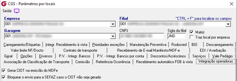 Cadastros → Parâmetros → Locais → Aba Integração Operadoras,