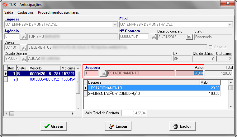 Essas Antecipações podem ser lançadas diretamente no contrato de viagem ou pela tela abaixo.