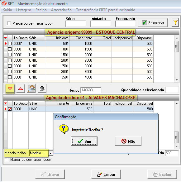 Inserindo as informações na tela acima, abrirá a tela a seguir, onde será definido os documentos a serem transferidos e se irá imprimir recibo ou não (definir o modelo na tela).