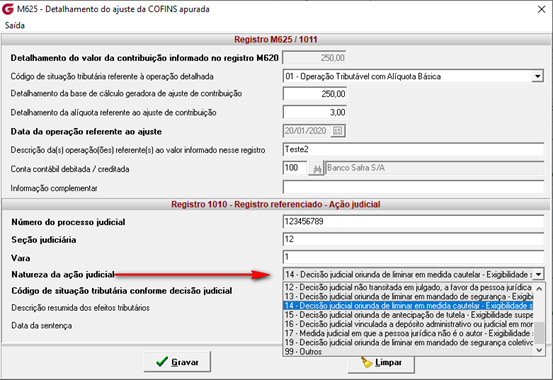 Aba: Apuração / Sub-aba: Ajustes de crédito/débito, para o Registro Detalhes do M225/1011, realizamos a alteração do campo “Natureza da ação judicial” e a criação do campo “Código de situação tributária conforme decisão judicial”.
