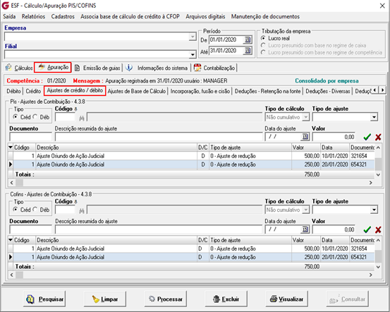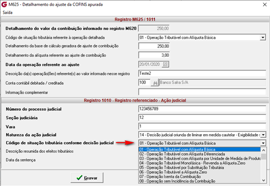 Aba: Apuração / Sub-aba: Ajustes de crédito/débito, para o Registro Detalhes do M225/1011, realizamos a alteração do campo “Natureza da ação judicial” e a criação do campo “Código de situação tributária conforme decisão judicial”.