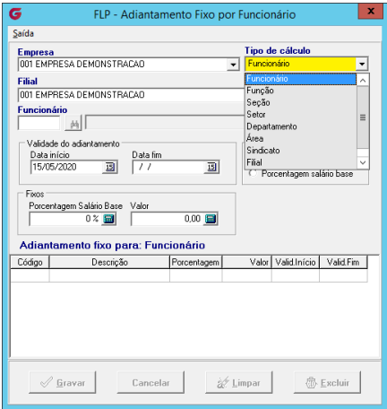 Informações Adiantamento Fixo - Percentuais de Adiantamento Diferentes. |