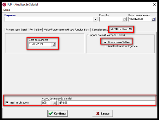 Menu: Rotinas Auxiliares > Atualização Salarial > Grava Novo Salário Na tela de atualização salarial > MP 936 / Covid – 19, preencha as opções: “Data do Aumento” e “Grava Novo Salário”, é necessário também realizar os preenchimentos de * Imprimir listagem e * Motivo de Alteração.