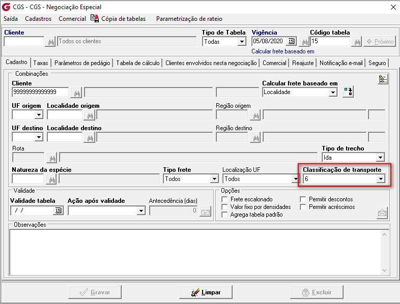 Associar no campo classificação de transporte a classificação que criou acima. Desta forma na geração do CT-e essa tabela será encontrada para cálculo.