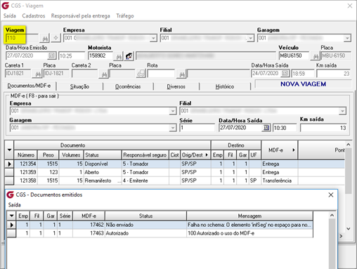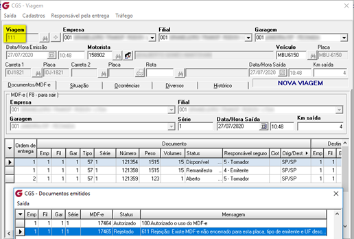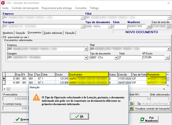 No exemplo, para o MDF-e 17469, informado o tipo de operação Lotação ou seja o remetente e destinatário dos documentos devem ser iguais, caso informe um documento, os quais remetente e destinatário diferentes, não será permitido, trazendo a mensagem.