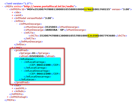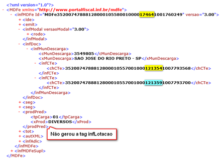 Na viagem 110, o MDF-e 17562 possui 01 CT-e único, neste caso será considerado o tipo de operação LOTAÇÃO criando a tag infLotacao dentro da tag proPed.