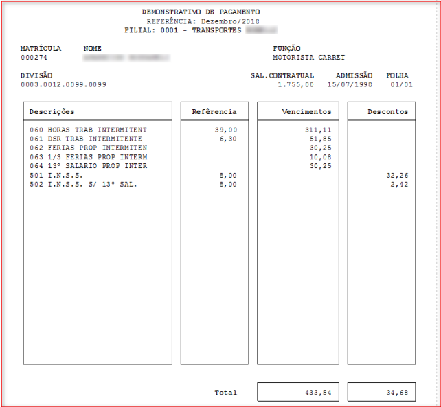 Salário Hora: 1755,00/220 = 7,97 * 39 horas = R$ 311,11. DSR: 311,11 /6 = 51,85. Férias: 311,11 + 51,86 = 362,97/12 = 30,25. 1/3 de férias: 30,25/3 = 10,08. 13º Salário: 311,11 + 51,86 = 362,97/12 = 30,25. Base Inss: 311,11 + 51,85 + 30,25 + 10,08 * 8% (Alíquota tabela) = 32,26 Inss Sal. Base Inss 13º Sal: 30,25 * 8% (Alíquota tabela) = 2,42 Inss 13º Sal. O cálculo do DSR foi composto pelo valor de 1/6 sobre a base quando empregado com vínculo celetista intermitente; Nota: Para cálculo diferenciado de alguma verba poderá ser criado fórmulas de cálculo. Envio dos Eventos S-1200 e S-2299 ao eSocial para Trabalhadores Intermitentes Na realização da Convocação/Efetivação, cálculo da folha ou quitação, ao gerar os eventos S-1200 ou S-2299, o sistema montará o agrupamento Caminho de acesso: Cadastros >> Contrato Intermitente >> Convocação Instruções de preenchimento: