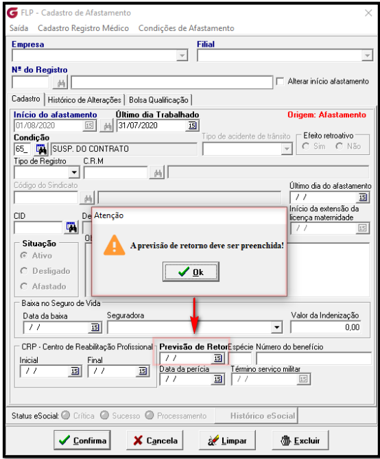 IMPORTANTE: O campo “Previsão de Retorno” torna-se obrigatório, caso não exista data de Último dia do Afastamento.