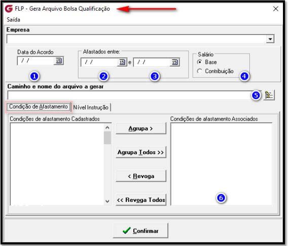 1 - Data do Acordo 2 - Data do início da suspensão do trabalhador 3 - Data fim da suspensão do trabalhador 4 - Opção Salário Base / Contribuição 5 - Caminho e nome do arquivo a gerar 6 - Associar condições de afastamento