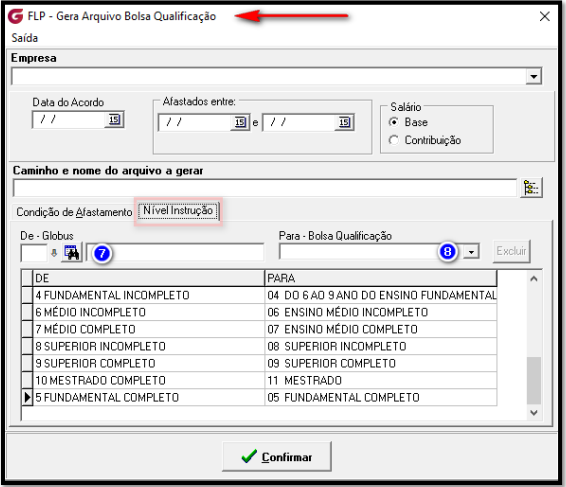 - Realizar na Tela Arquivo Bolsa Qualificação na aba Nível de Instrução o DE/PARA do grau de instrução de acordo com o Leiaute.