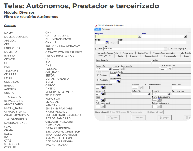 Abaixo apresentamos algumas telas e campos que contemplam o relatório, como: