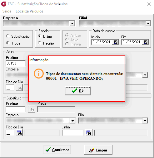 Exemplo da tela de troca e substituição