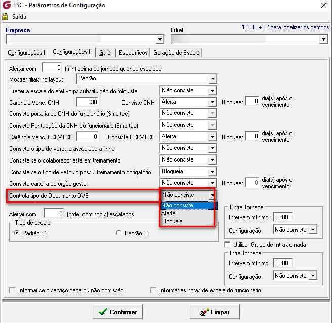 Nessa tela o usuário parametrizar qual é tipo de validação que o sistema deve fazer. O sistema irá ter três opções, (Não Consiste, Alerta, Bloqueia).