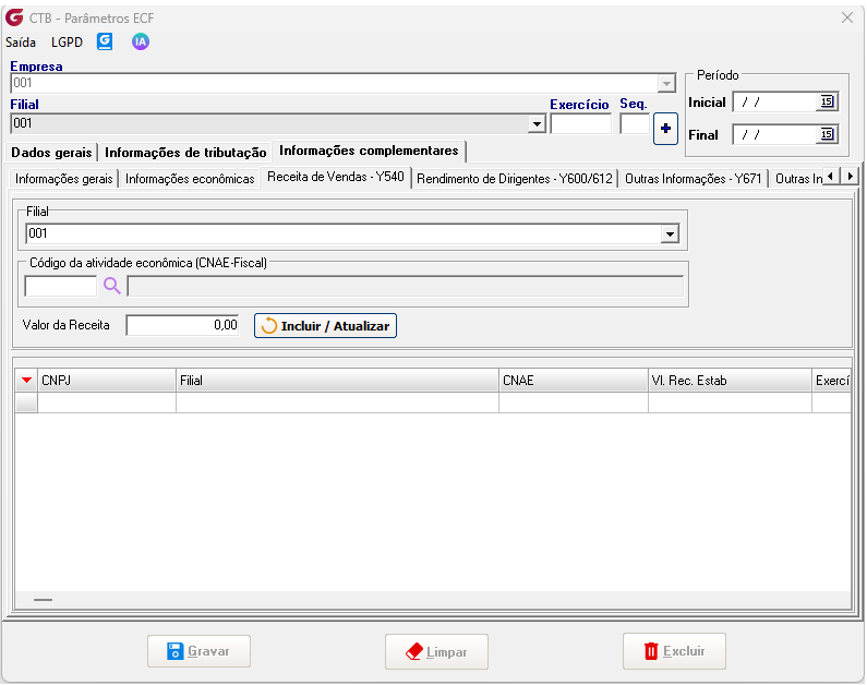 Comtemplam as abas: Informações gerais, econômicas, receita de vendas, rendimento de dirigentes, e outras informações. Preencher conforme necessidade da empresa e gravar.